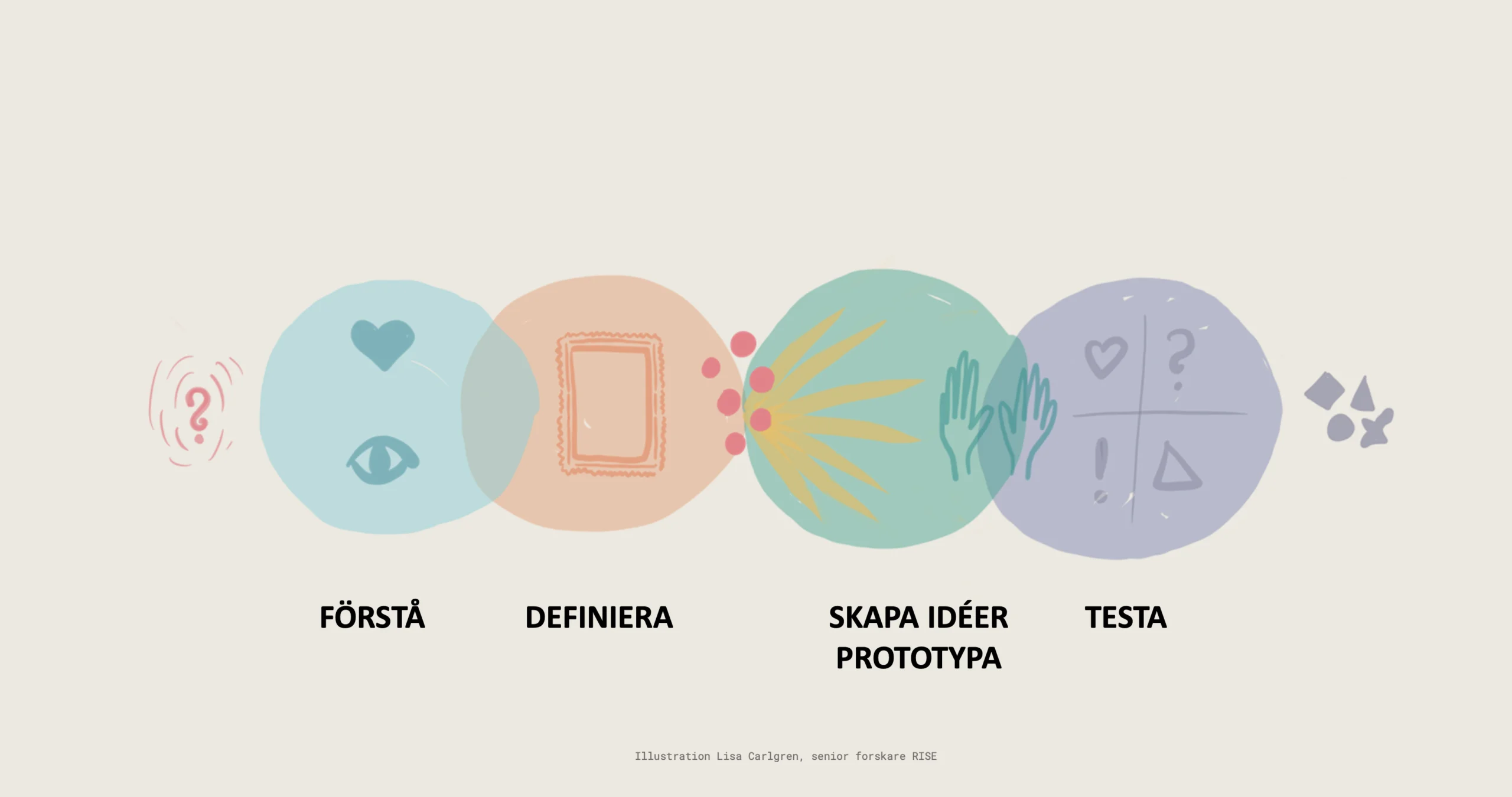 I stället för att snabbt gå till lösning ligger fokus på att komma förbi den första tanken, fördjupa förståelsen av utmaningen och våga experimentera – även när det innebär att misslyckas och börja om. Ständig reflektion, samskapande över organisationsgränser och en trygg lärandemiljö är centrala förutsättningar för att innovation ska kunna uppstå.